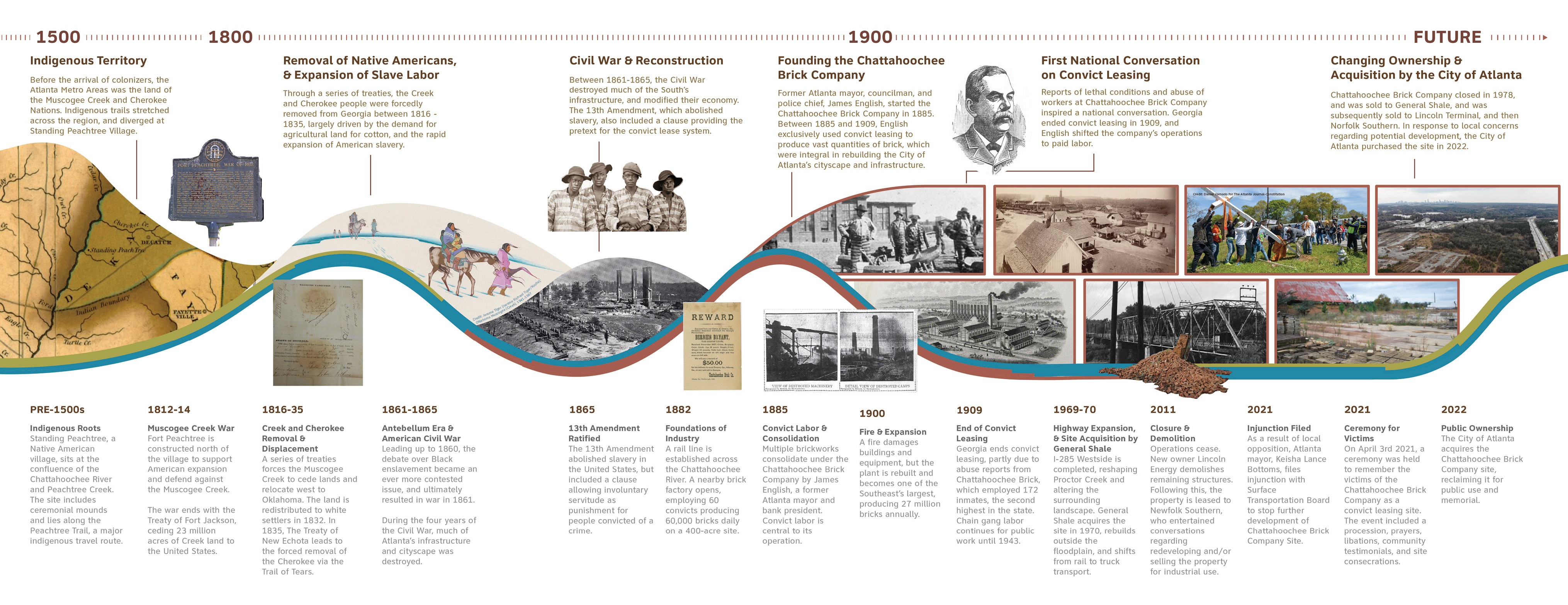 The Chattahoochee Brick Company, owned by former Atlanta Mayor James W. English, supplied bricks for the construction of industrial buildings and City of Atlanta infrastructure, such as roads and sewers, starting in 1885. The factory used leased convict labor, forcing primarily African American men, who were often arrested under petty or dubious charges, to work under brutal, sometimes fatal, conditions to produce a profit for the company’s owners. The Chattahoochee Brick Company ceased operations in 1972, and its successor, General Shale Brick, demolished all the buildings in 2011.